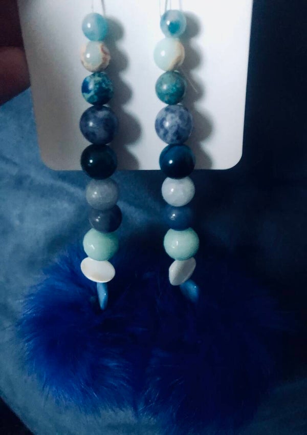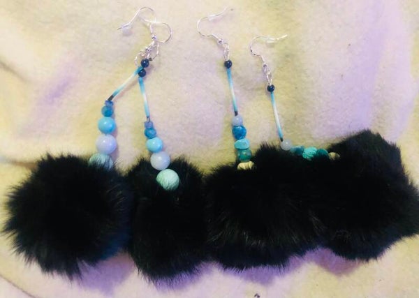 Handmade with soft black rabbit fur. These are large sized pompom earrings, with added bone beads, custom hand dyed (or natural) light blue porcupine quills, and matching semi-precious stones. The findings (earring hooks) are sterling silver.