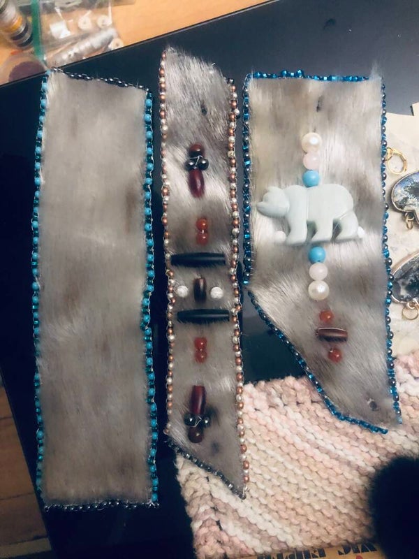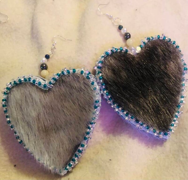 The sealskin earrings come in both pompom style and flat beaded style. The flat beaded style comes in a variety of shapes, with hearts and various circle sizes being most popular.