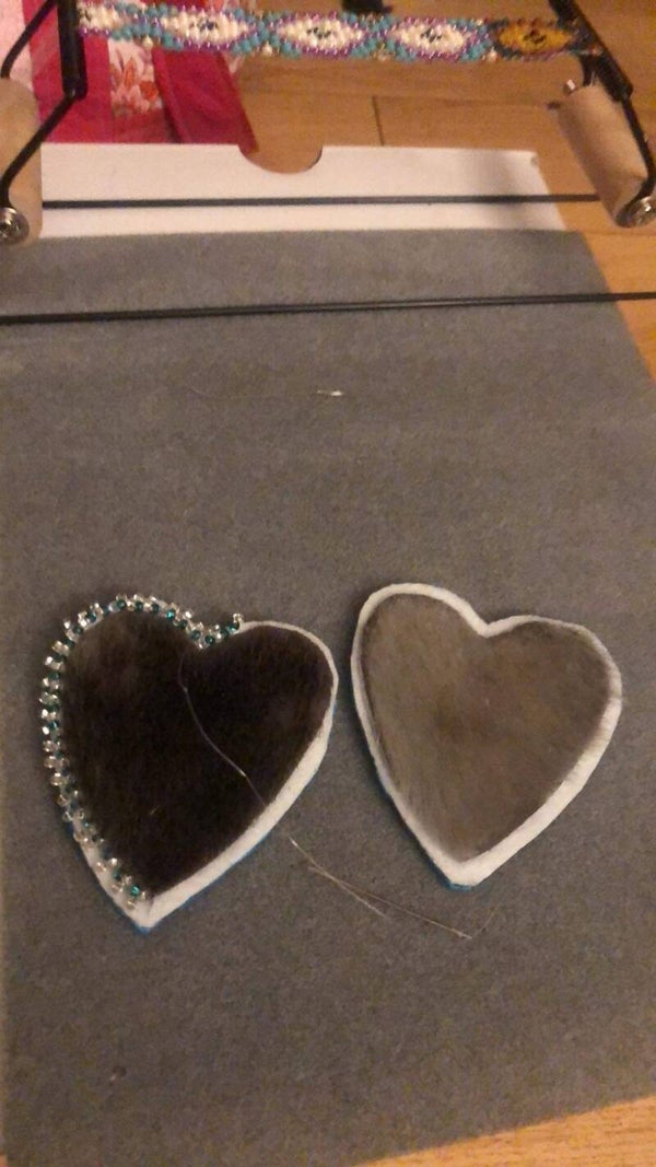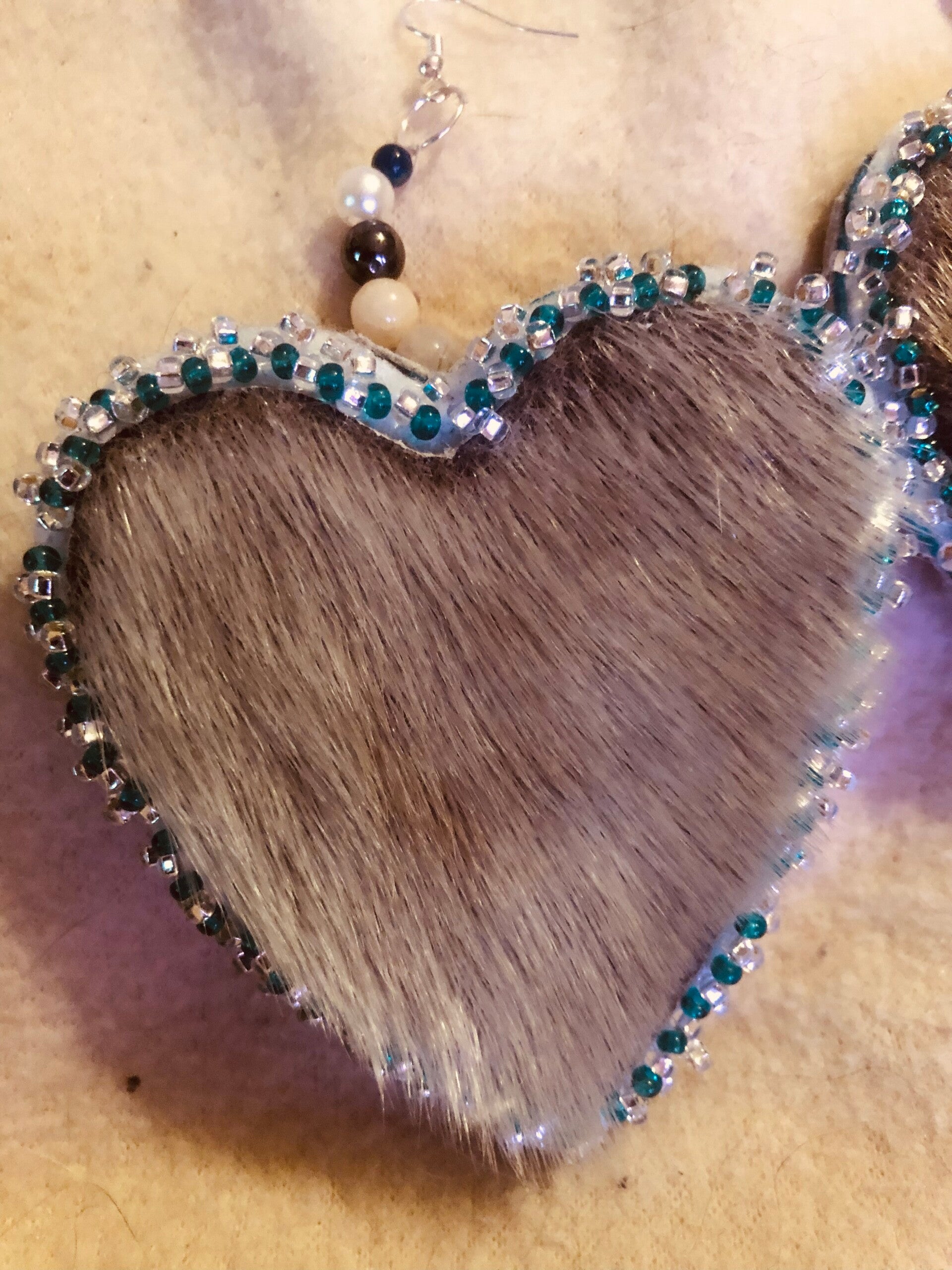 Natural sealskin earrings that are available in a couple of styles, including pompom and beaded shapes (square, triangle, heart, rectangle...). All styles are created with the addition of bone beads and semi-precious stones (beads)