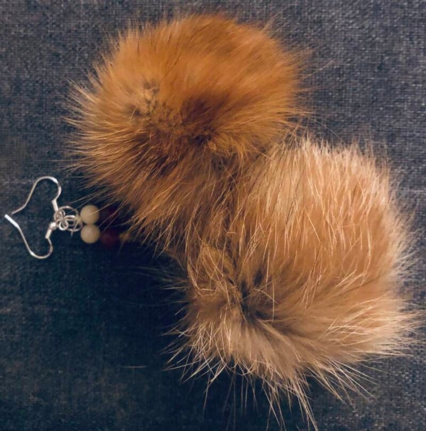 Canadian red fox fur* and northern coyote fur pompom style earrings that are all hand sewn and carefully hand crafted.