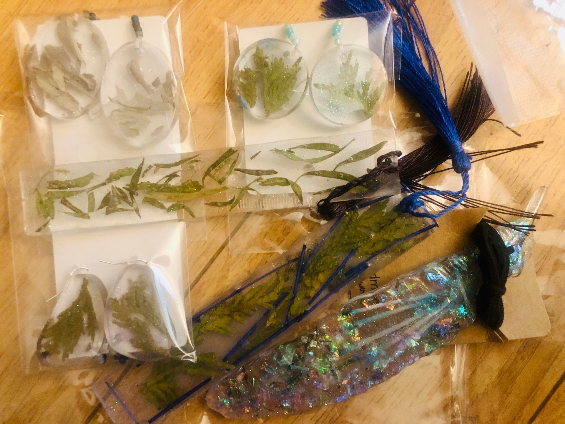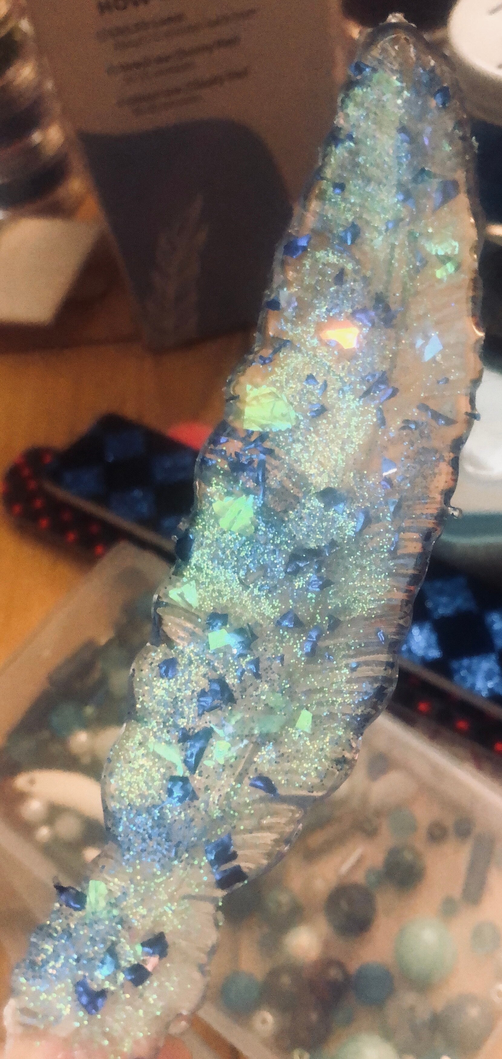 Some resin jewelry and bookmarks come with sparkly accents and/or glitter chunks, coloured beads, porcupine quills (dyed or non-dyed), and other decorative accentuated options are also available (upon request)!